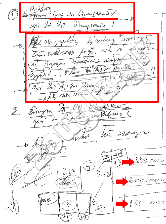 (στο πρώτο πλαίσιο διακρίνεται πώς ο Άκης έχει σκοπό να μοιράσει 200.000 ευρώ, ενώ στο κάτω μέρος του εγγράφου αναφέρει: «θα το προετοιμάσω για να εκδοθεί απόφαση στο υπουργικό συμβούλιο»)