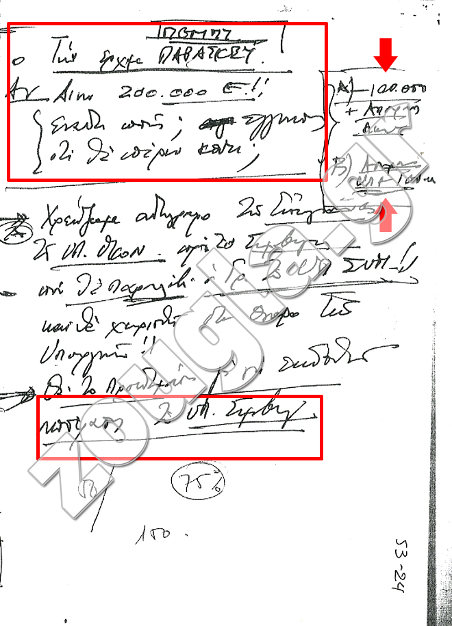 (στο πρώτο κόκκινο πλαίσιο διακρίνεται η πρόταση της γραμματείας του υπουργείου Οικονομικών ενώ ο Άκης Τσοχατζόπουλος σημειώνει: « Nα απορριφθεί η παροχή δικαστικής συνδρομής στην Ελλάδα». Με τα κόκκινα βέλη διακρίνονται τα ποσά που είχε σκοπό να μοιράσει στους εμπλεκομένους. Επίσης διακρίνεται ότι «εγκρίνεται το σχέδιο Α του Daniel- Eλβετού δικηγόρου»)