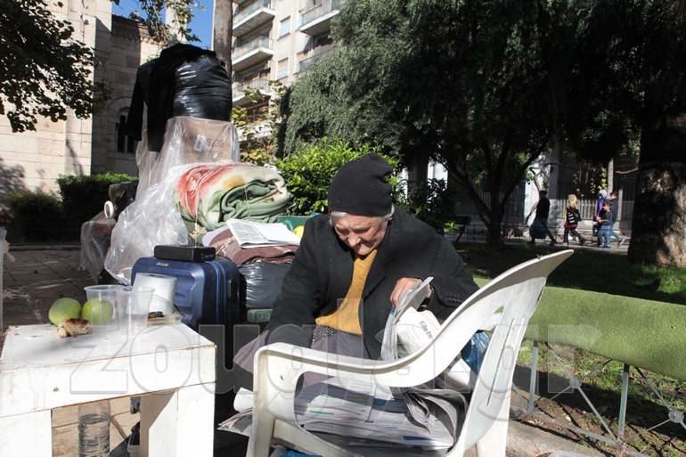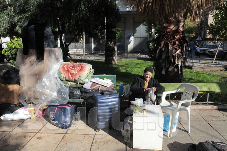 Κοιμούνται πάνω στις πέτρινες πλάκες. Έχουν μεταφέρει στο σημείο αυτό τις κουβέρτες και τα λιγοστά σκεύη, τα οποία χρησιμοποιούν για την καθημερινή τους σίτιση. Ζούσαν σε ένα διαμερισματάκι, όπου δεν πλήρωναν τα ενοίκια τους τελευταίους τέσσερις μήνες.