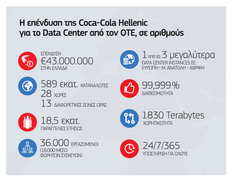Δύο από τους μεγαλύτερους επιχειρηματικούς Ομίλους στη χώρα, η Coca-Cola Hellenic και ο ΟΤΕ, έρχονται κοντά μέσα από μια σημαντική αναπτυξιακή συνεργασία για την εγκατάσταση και λειτουργία Data Center στην Ελλάδα, ένα έργο ύψους 43 εκατ ευρώ. Έπειτα από διεθνή διαγωνισμό, η Coca-Cola Hellenic ανέθεσε στον Όμιλο ΟΤΕ τη λειτουργία του Data Center που εξυπηρετεί τις επιχειρησιακές εφαρμογές πληροφορικής περισσότερων από 36.000 εργαζομένων της στις 28 χώρες όπου δραστηριοποιείται. Το Data Center της Coca-Cola Hellenic, είναι ένα από τα τρία μεγαλύτερα Data Center στην περιοχή της Ευρώπης, της Μέσης Ανατολής και της Αφρικής, καθώς και ένα από τα μεγαλύτερα ιδιωτικά έργα που αναλαμβάνει ο Όμιλος ΟΤΕ.