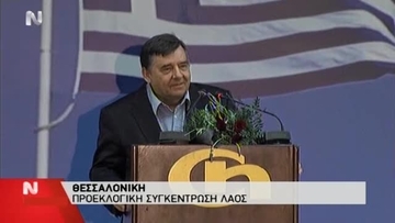 Γύρω από τον άξονα του συνθήματος «η Ελλάδα ανήκει στους Έλληνες» κινήθηκε η ομιλία του προέδρου του Λαϊκού Ορθόδοξου Συναγερμού Γιώργου Καρατζαφέρη, ο οποίος έκανε λόγο και για διωγμό των μεταναστών από την Ελλάδα, όχι όμως με την βία αλλά με νόμιμα μέσα.