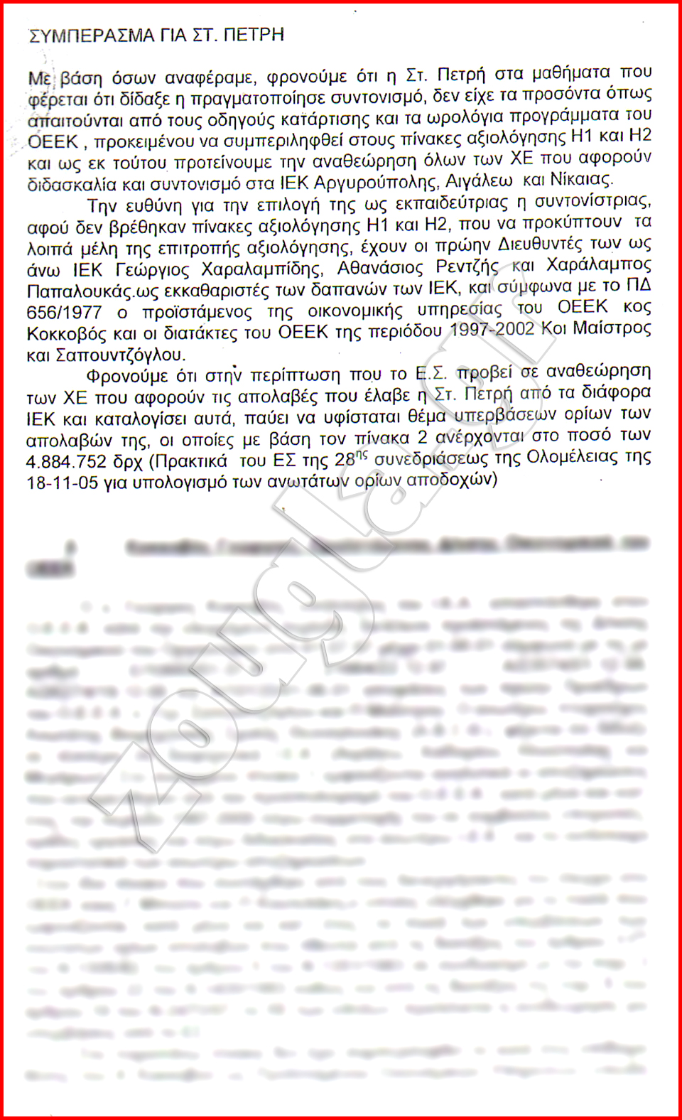 Αναφέρεται στο πόρισμα: «Θεωρούμε ότι διδασκαλία και συντονισμός π.χ. 212 ωρών μηνιαίως δεν είναι δυνατόν να πραγματοποιηθεί ειδικά απογευματινές ώρες (ώρες λειτουργίας Ι.Ε.Κ.). Φρονούμε ότι η Σταματίνα Πετρή στα μαθήματα που φέρεται ότι δίδαξε ή πραγματοποιούσε συντονισμό, δεν είχε τα προσόντα όπως απαιτούνται από τους οδηγούς κατάρτισης και τα ωρολόγια προγράμματα του Ο.Ε.Ε.Κ.».