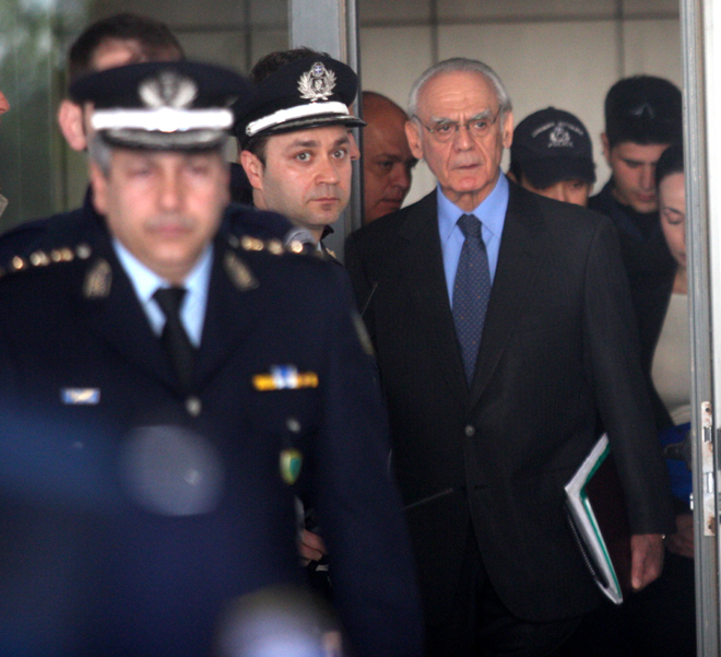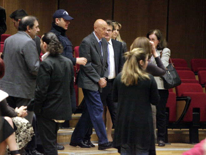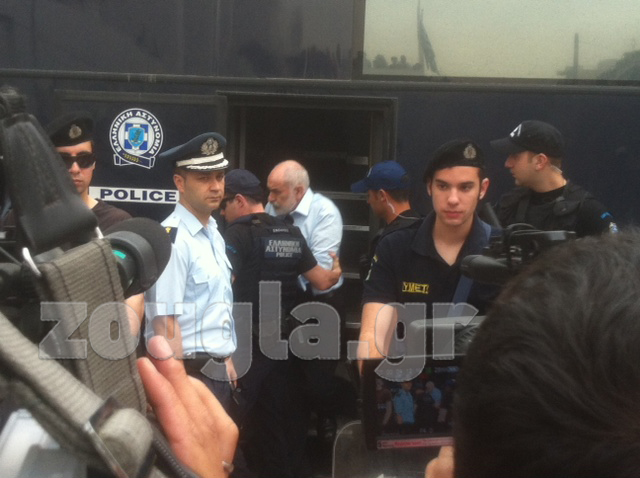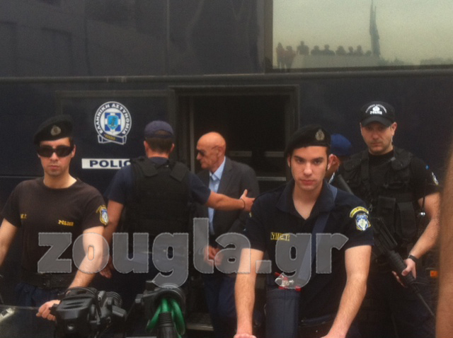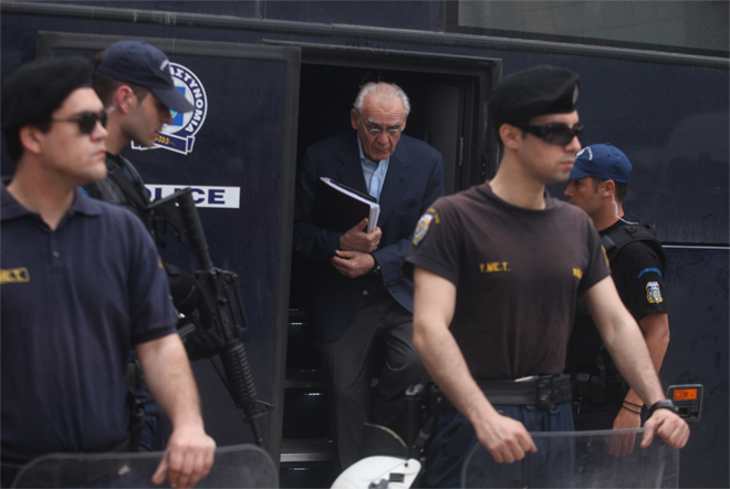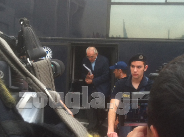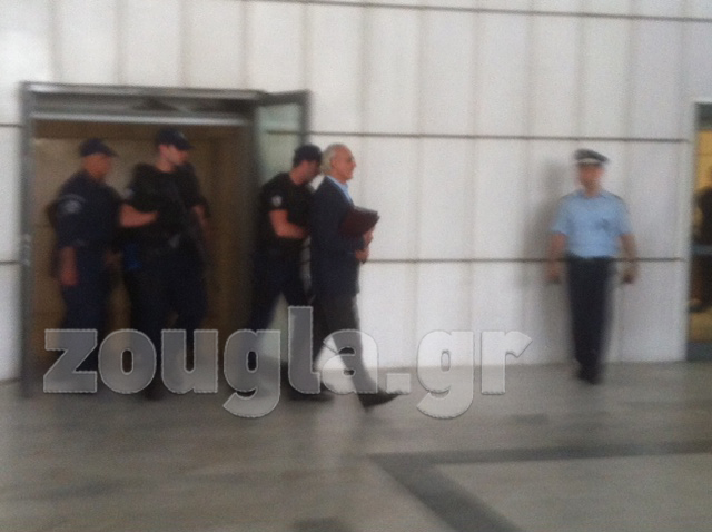 Ο πρώην υπουργός εισήλθε στο κτήριο χωρίς χειροπέδες, κρατώντας τον γνωστό φάκελό του, ενώ η σύζυγός του έφθασε φανερώς καταβεβλημένη, ντυμένη στα μαύρα. Η δίκη ξεκίνησε λίγο μετά τις 09.00 με ενστάσεις, με την υπεράσπιση των 19 κατηγορουμένων να εκφράζει αντιρρήσεις για την παράσταση πολιτικής αγωγής εκ μέρους του ελληνικού Δημοσίου.