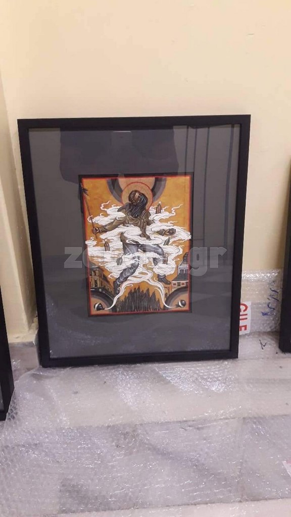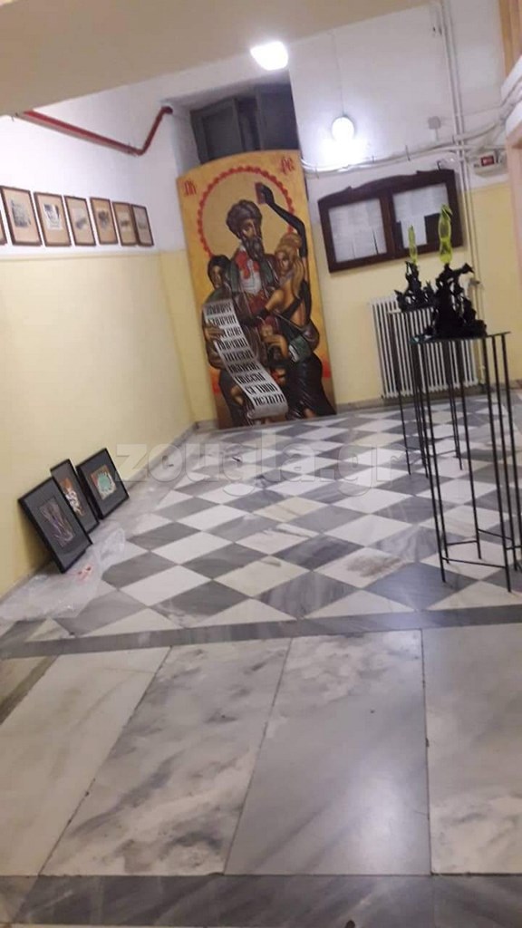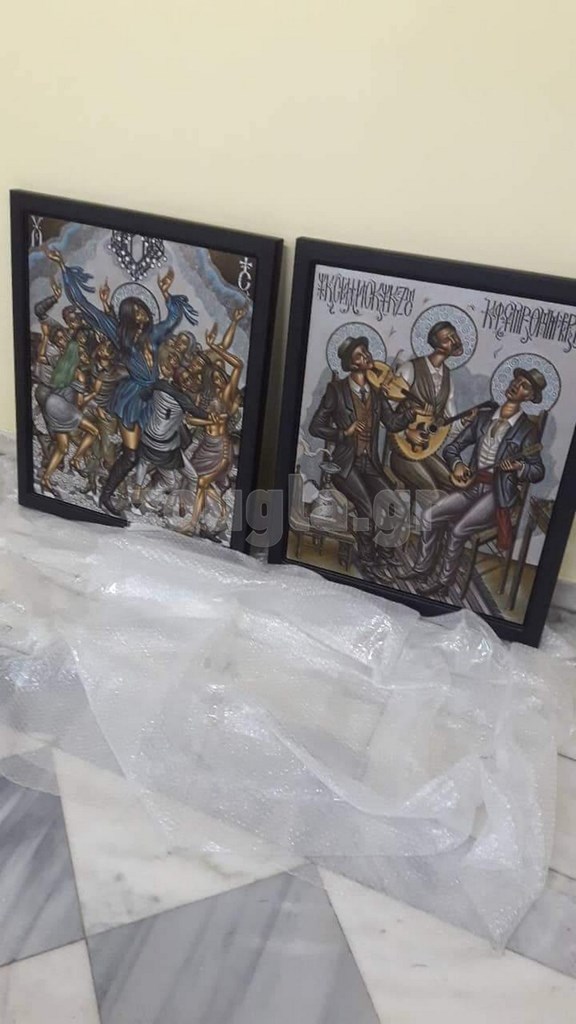 Υπό την αιγίδα του Δήμου Ύδρας πραγματοποιείται έκθεση με καλλιτεχνικό event στο νησί. Τα τελευταία είκοσι χρόνια αυτή η έκθεση φιλοξενείται στο σχολικό κτήριο της υπέροχης αυτής μικρής πόλης. Λόγω όμως εργασιών ανακαίνισης αυτήν τη χρονιά ζητήθηκε η συνδρομή της Ακαδημίας Εμποροπλοιάρχων Ύδρας. Η απάντηση ήταν θετική. Άρχισε λοιπόν να στήνεται η έκθεση και να τοποθετούνται τα εκθέματα. Ο διοικητής της σχολής κ. Δανόπουλος, φρόντισε να ενημερώσει και τον Δεσπότη περί των εκθεμάτων. Όντως αυτά τα εκθέματα θα μπορούσαν να «ξενίσουν». Υπό τύπον «αγιογραφίας», απεικονίζονται πρόσωπα που παραπέμπουν σε σεπτές μορφές . Ωστόσο αυτοί οι «άγιοι» επιδίδονται σε εξαιρετικά «κοσμικές δραστηριότητες». Έτσι ο Επίκουρος, ο ηδονιστής, (σε βυζαντινή εκδοχή αγίου), που να το πίστευε ο άμοιρος φιλόσοφος, εμφανίζεται να παίζει μπουζούκι ή να εναγκαλίζεται γυναίκα – κούγκαρ ή ακόμη και να τον περιτυλίγουν με αραχνοΰφαντες χλαμύδες ερωτικά ξωτικά με γυναικείες μορφές. Καλό ακούγεται για ….«ηδονιστή» αλλά αναπόφευκτα είναι περίεργο ως «αγιογραφική» εκδοχή.