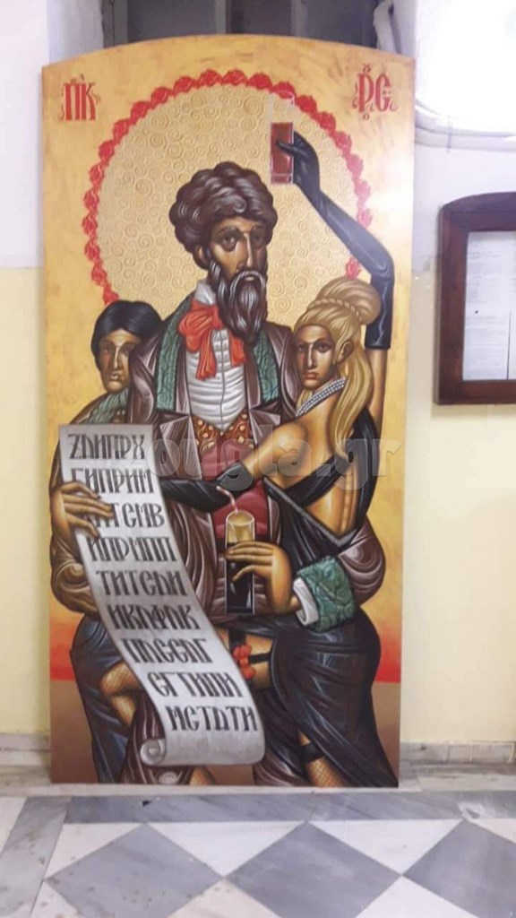 Υπό την αιγίδα του Δήμου Ύδρας πραγματοποιείται έκθεση με καλλιτεχνικό event στο νησί. Τα τελευταία είκοσι χρόνια αυτή η έκθεση φιλοξενείται στο σχολικό κτήριο της υπέροχης αυτής μικρής πόλης. Λόγω όμως εργασιών ανακαίνισης αυτήν τη χρονιά ζητήθηκε η συνδρομή της Ακαδημίας Εμποροπλοιάρχων Ύδρας. Η απάντηση ήταν θετική. Άρχισε λοιπόν να στήνεται η έκθεση και να τοποθετούνται τα εκθέματα. Ο διοικητής της σχολής κ. Δανόπουλος, φρόντισε να ενημερώσει και τον Δεσπότη περί των εκθεμάτων. Όντως αυτά τα εκθέματα θα μπορούσαν να «ξενίσουν». Υπό τύπον «αγιογραφίας», απεικονίζονται πρόσωπα που παραπέμπουν σε σεπτές μορφές . Ωστόσο αυτοί οι «άγιοι» επιδίδονται σε εξαιρετικά «κοσμικές δραστηριότητες». Έτσι ο Επίκουρος, ο ηδονιστής, (σε βυζαντινή εκδοχή αγίου), που να το πίστευε ο άμοιρος φιλόσοφος, εμφανίζεται να παίζει μπουζούκι ή να εναγκαλίζεται γυναίκα – κούγκαρ ή ακόμη και να τον περιτυλίγουν με αραχνοΰφαντες χλαμύδες ερωτικά ξωτικά με γυναικείες μορφές. Καλό ακούγεται για ….«ηδονιστή» αλλά αναπόφευκτα είναι περίεργο ως «αγιογραφική» εκδοχή.