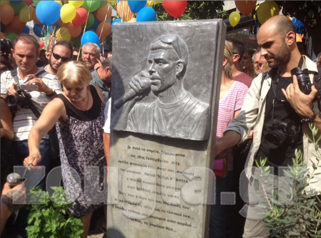 Στο πεζοδρόμιο όπου άφησε την τελευταία του πνοή ο Παύλος Φύσσας, χτυπημένος από το μαχαίρι μέλους της Χρυσής Αυγής, δεσπόζει από σήμερα μια επιτύμβια στήλη, που όλοι φιλοδοξούν να αποτελέσει μνημείο-ταφόπλακα του μίσους, του φασισμού και κάθε μορφής ρατσισμού…