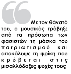 Στο πεζοδρόμιο όπου άφησε την τελευταία του πνοή ο Παύλος Φύσσας, χτυπημένος από το μαχαίρι μέλους της Χρυσής Αυγής, δεσπόζει από σήμερα μια επιτύμβια στήλη, που όλοι φιλοδοξούν να αποτελέσει μνημείο-ταφόπλακα του μίσους, του φασισμού και κάθε μορφής ρατσισμού…