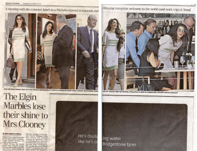 «Σας αποστέλλω το άρθρο της Daily Telegraph. Έτσι γελοιοποιήθηκε η Ελλάδα στον Αγγλικό Τύπο σήμερα. Άρχισε ήδη να χάνει την ουσία το ζήτημα της επιστροφής των γλυπτών του Παρθενώνα. Η προβολή εστράφη αποκλειστικά στην Alamuddin.