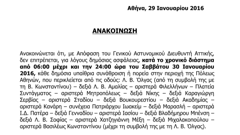 Με απόφαση του Αττικάρχη, η Ελληνική Αστυνομία ανακοίνωσε το βράδυ της Παρασκευής ότι απαγορεύει για αύριο, Σάββατο, τη διεξαγωγή των συγκεντρώσεων στην Αττική.