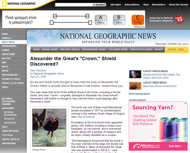 «Το άρθρο που διαβάσατε στην ιστοσελίδα του National Geographic (nationalgeographic.com), και πιο συγκεκριμένα στη στήλη National Geographic News, αφορά ρεπορτάζ της δημοσιογράφου, η οποία πήρε συνέντευξη από τον συγκεκριμένο συνταξιούχο καθηγητή αρχαιολογίας -που πιθανώς έχει καταγωγή από τα Σκόπια- και παρουσίασε την ανακοίνωσή του τον Ιανουάριο σε συνέδριο του Αμερικανικού Αρχαιολογικού Ινστιτούτου».