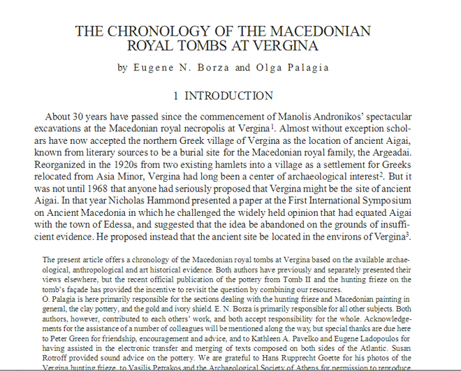 Αφορμή για το δημοσίευμα του Ν National Geographic υπήρξε το συνέδριο που οργανώσαμε στο Σικάγο για τη χρονολόγηση των βασιλικών τάφων της Βεργίνας. Το Νάσιοναλ Τζεογκράφικ επικεντρώθηκε σε ένα από τα συμπεράσματά μας, ότι ο Τάφος Β περιείχε τα όπλα του Μεγάλου Αλεξάνδρου, τα οποία πήρε ο αδελφός του Φίλιππος Γ Αρριδαίος. Υποστηρίξαμε ότι η χρυσελεφάντινη ασπίδα της Βεργίνας δεν ανήκε στον Φίλιππο Β αλλά στον Αλέξανδρο και ότι θάφτηκε μαζί με τον αδελφό και διάδοχό του. Πώς μπορούν οι απόψεις μας αυτές να εκληφθούν ως προπαγάνδα των Σκοπίων όταν το μόνο μας μέλημα είναι να αποδείξουμε ότι ο ελληνικός λαός κατέχει τα όπλα του Μεγάλου Αλεξάνδρου και ότι ο Φίλιππος Β είναι θαμμένος δίπλα στον γιο του Φίλιππο Γ Αρριδαίο στη βασιλική πρωτεύουσα των Αιγών;