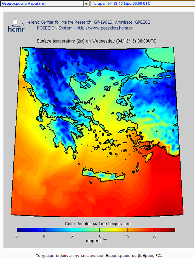 Αυξημένες νεφώσεις με τοπικές βροχές στην Ανατολική Στερεά, την Εύβοια, την Κεντρική και Ανατολική Πελοπόννησο και το Αιγαίο, περιμένουμε την Τετάρτη 4 Δεκεμβρίου 2013. Χιονοπτώσεις θα σημειωθούν στις ορεινές περιοχές αλλά και σε περιοχές της Στερεάς και της Πελοποννήσου με σχετικά χαμηλό υψόμετρο. Στην υπόλοιπη χώρα ο καιρός θα είναι καλός αλλά με έντονο κρύο.