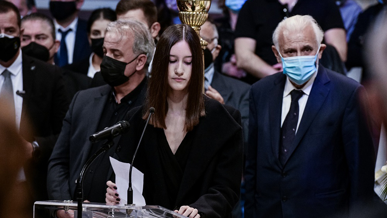 Με σπασμένη φωνή από τη συγκίνηση, η μεγαλύτερη κόρη της, Αιμιλία, υπογράμμισε: «Η ζωή σου είναι οδηγός. Μια ζωή γεμάτη αλήθεια, αξιοπρέπεια κι ελπίδα. Αυτά μας έμαθες Στις τελευταίες μας κουβέντες μού είπες «1,2,3 πάμε». Και μου έδωσες τα χέρια σου για να σηκωθείς. Έτσι έφυγες, όρθια και με το κεφάλι ψηλά, όπως αρμόζει σε μια μαχήτρια. Δεν λύγισες, δεν ηττήθηκες. Μια μάχη που δεν παραδίδεις τα όπλα είναι μια μάχη κερδισμένη. Το χέρι χτυπούσες στο τραπέζι και τα πράγματα γίνονταν όπως έπρεπε. Το χέρι το χτύπησες πολλές φορές σαν κορίτσι, γυναίκα, μητέρα και κέρδισες. Δεν ήταν ποτέ σκληρό, ήταν απαλό και γεμάτο ανιδιοτέλεια. Η αγκαλιά σου ήταν ζεστή, τρυφερή, αλλά και ασπίδα δυνατή, σαν εσένα. Αυτό το οικείο άρωμα που δεν ξεκολλάει από πάνω μας, το χαμόγελό σου, το χάδι σου, το “φάμιλι” που έλεγες όταν έμπαινες στο σπίτι και κυρίως το ζεϊμπέκικο της ζωής που χόρεψες καλύτερα απ’ όλους, οδηγός για μια ζωή γεμάτη αγάπη, χαμόγελο, αλήθεια, αξιοπρέπεια και ελπίδα. Αυτά μας έμαθες και να είσαι σίγουρη ότι θα τα ακολουθήσουμε».