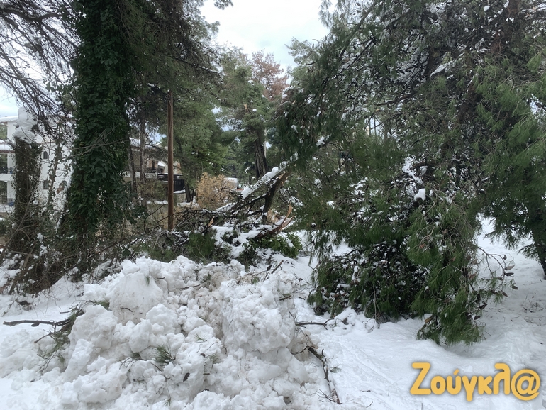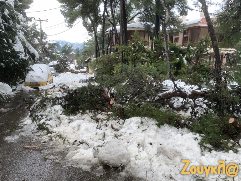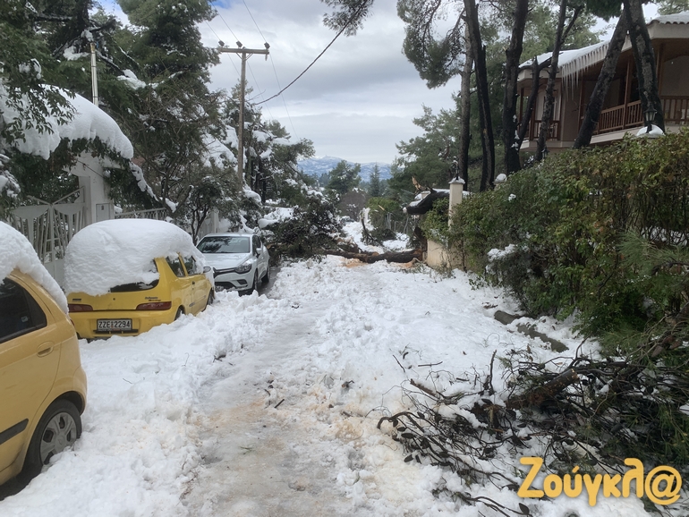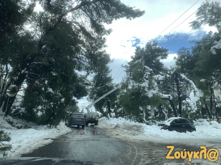 Ακόμα και αν στους κεντρικούς δρόμους τα προβλήματα έχουν εν πολλοίς ξεπεραστεί και η κυκλοφορία διεξάγεται κανονικά, χωρίς τη χρήση αντιολισθητικών αλυσίδων, σε πολλές περιοχές, στα στενά, ο αποκλεισμός είναι απόλυτος. Ολόκληροι κορμοί δέντρων ή, χειρότερα, ηλεκτροφόρα καλώδια παραμένουν πεσμένα στη μέση του δρόμου, αποκλείοντας πλήρως την πρόσβαση από και προς τις κατοικίες. Και φυσικά ελλοχεύει σοβαρός κίνδυνος για τους περαστικούς…