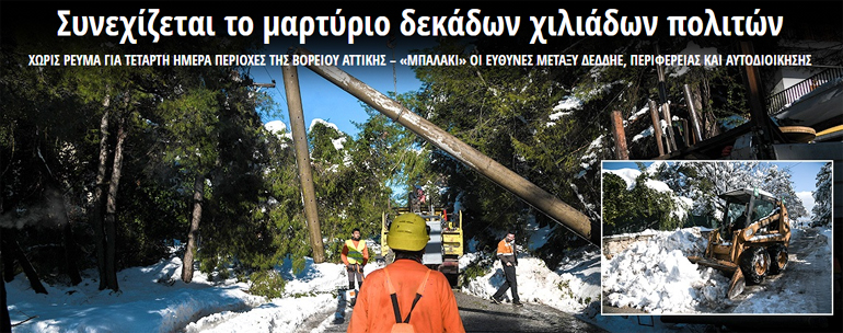 «Βομβαρδισμένο τοπίο» θυμίζει ο Δήμος Διονύσου τέσσερα 24ωρα μετά την πρώτη χιονόπτωση που έπληξε την Αττική και ειδικά τα βόρεια προάστια, καθώς ολόκληρες γειτονιές παραμένουν χωρίς τα… βασικά αγαθά του πολιτισμού μας: ρεύμα και νερό.