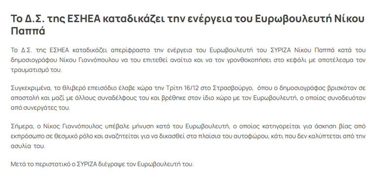 «Το Δ.Σ. της ΕΣΗΕΑ καταδικάζει απερίφραστα την ενέργεια του Ευρωβουλευτή του ΣΥΡΙΖΑ Νίκου Παππά κατά του δημοσιογράφου Νίκου Γιαννόπουλου να του επιτεθεί αναίτια και να τον γρονθοκοπήσει στο κεφάλι με αποτέλεσμα τον τραυματισμό του.