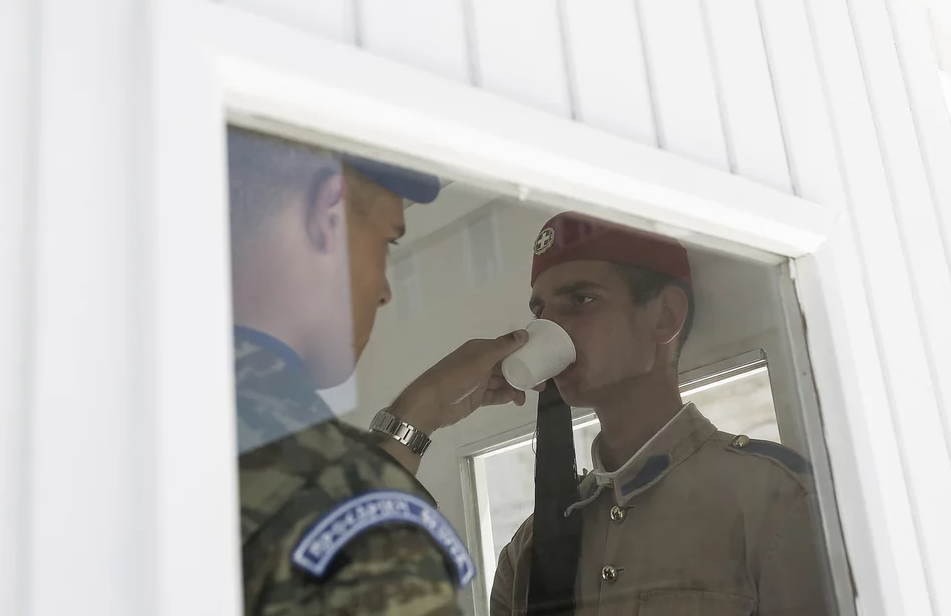 Σε φωτογραφίες που είδαν το φως της δημοσιότητας, ο αξιωματικός υπηρεσίας της Προεδρικής Φρουράς φαίνεται να τους προσφέρει παγωμένο νερό, σκουπίζοντας τον ιδρώτα από τα πρόσωπά τους.