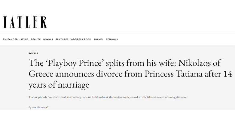 Τον γύρο του κόσμου έκανε τις τελευταίες ημέρες η είδηση του διαζυγίου του Νικόλαου και της Τατιάνας Μπλάτνικ. Το Tatler, το διάσημο περιοδικό των γαλαζοαίματων έκανε αναφορά στον χωρισμό του ζεύγους, όπου χαρακτήρισε τον Νικόλαο ως «Playboy Prince».