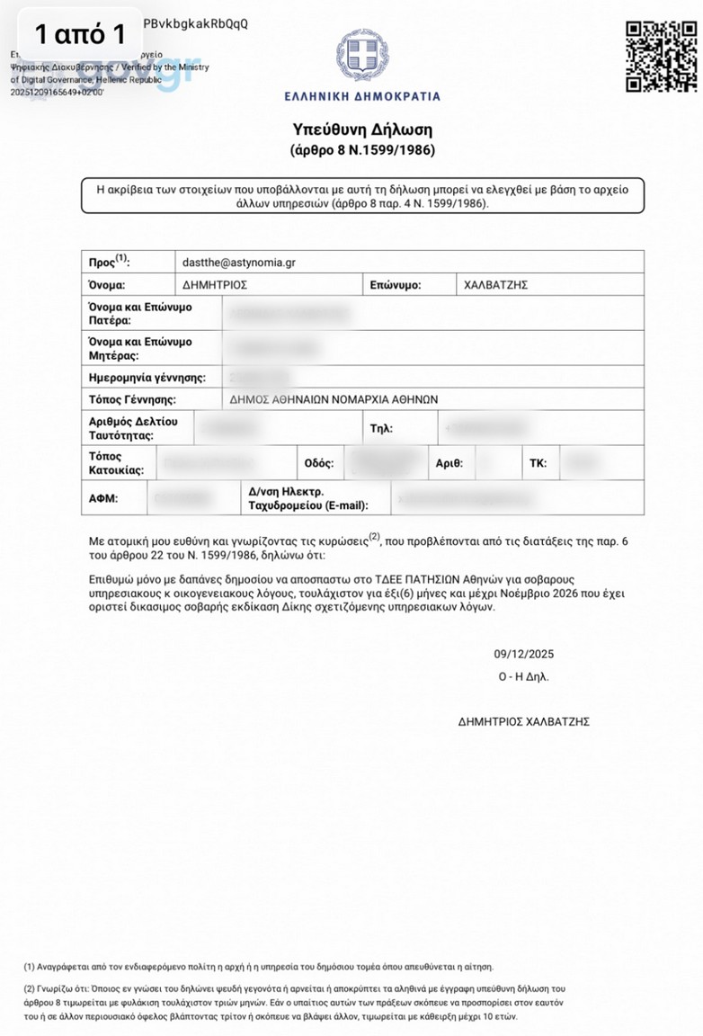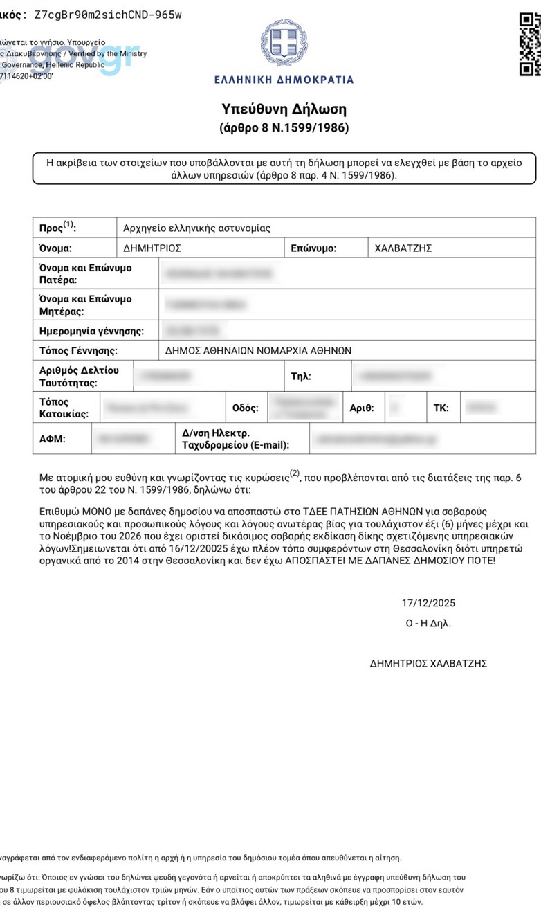 Ακολούθως σύμφωνα πάντα με την νέα καταγγελία αλλά και τα έγγραφα που απέστειλε στη «Ζούγκλα» ο Βασίλης Χαλβατζής, ο αδελφός του Δημήτρης, άλλαξε μέσω gov.gr στις 16/12/2025 τον τόπο συμφερόντων του μεταφέροντας τον στη Θεσσαλονίκη από την Αθήνα και στις 17/12, το γνωστοποίησε με υπεύθυνη δήλωση, ζητώντας εκ νέου την απόσπαση του για τους γνωστούς λόγους.