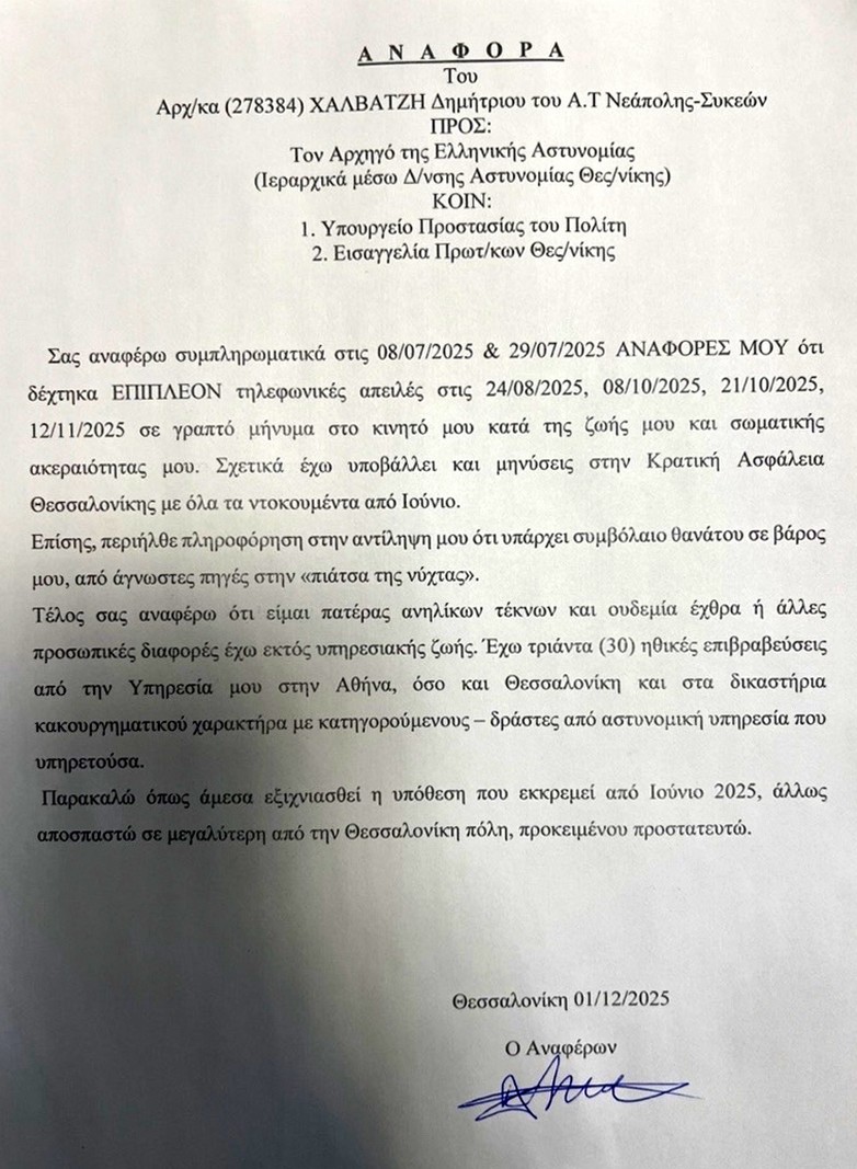 Ωστόσο στην πορεία, προέκυψαν νεότερα στοιχεία, όπως επισημαίνει με τη νέα καταγγελία του στη «Ζούγκλα», ο Βασίλης Χαλβατζής, τονίζοντας ότι όπως τον πληροφόρησε ο αδελφός του Δημήτρης, υπάρχει συμβόλαιο θανάτου εις βάρος του από την αλβανική μαφία, κάτι που ο αστυνομικός γνωστοποίησε προς όλες τις υπερκείμενες Αρχές, με έγγραφη αναφορά την 1η Δεκεμβρίου 2025, με την οποία αιτήθηκε εκ νέου την απόσπαση του.