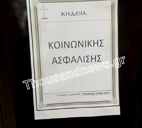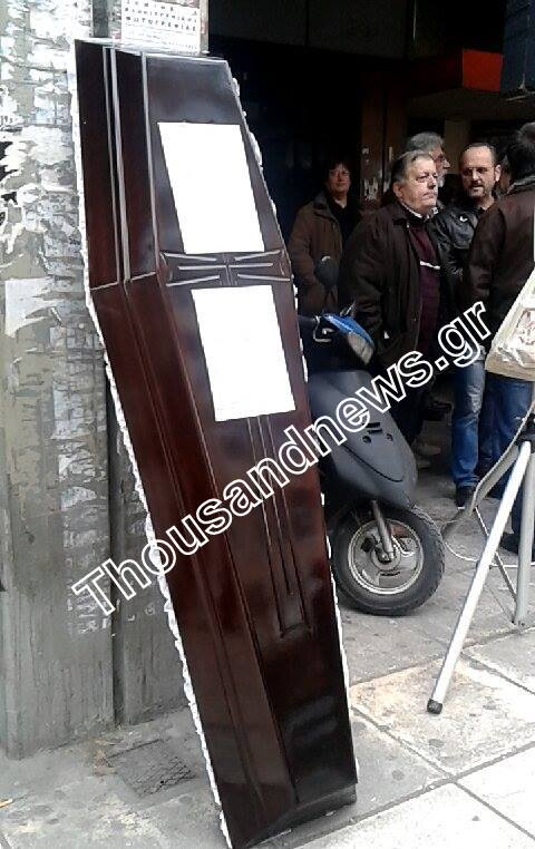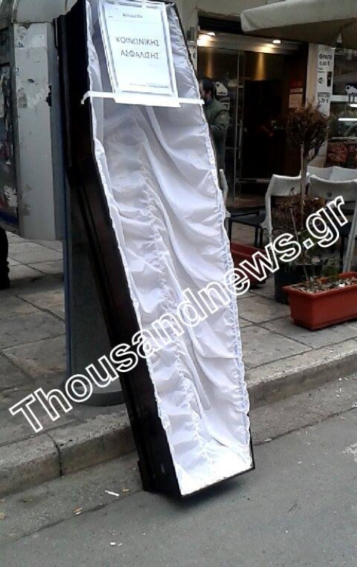 Οικοδόμοι, μαζί με ξυλουργούς και μισθωτούς επαγγελματίες, έστησαν ένα… φέρετρο έξω από τα γραφεία του ΟΑΕΔ επί της οδού Δωδεκανήσου, βάζοντας πάνω στο καπάκι ένα χαρτί το οποίο γράφει «Κοινωνική Ασφάλιση» και «Γραφείο Τελετών: κυβέρνηση ΣΥΡΙΖΑ-ΑΝΕΛ».