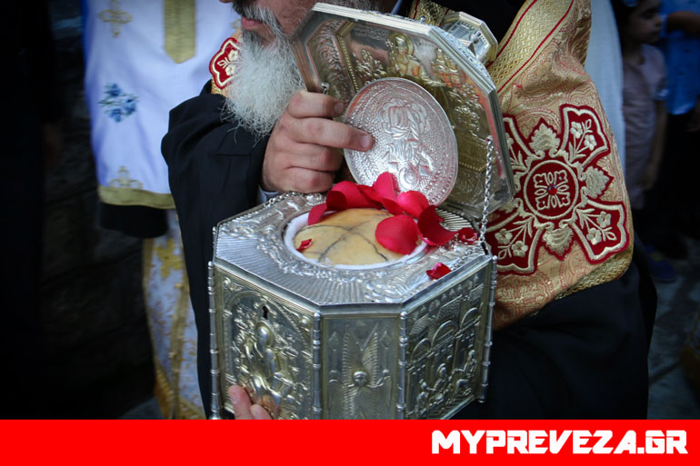 Πλήθος κόσμου συγκεντρώθηκε από νωρίς μπροστά από το Δημαρχείο της Φιλιππιάδας, όπου στις 17:00 το απόγευμα έφτασε από την ΙεράςΜονή Αγίου Βησσαρίωνα Δουσίκου, όπου φυλάσσεται, η Τίμια Κάρα την οποία παρέλαβε ο Σεβασμιώτατος Μητροπολίτης Νικοπόλεως και Πρεβέζης κ.κ Χρυσόστομος από τον Σεβασμιώτατο Μητροπολίτη Τρίκκης και Σταγών κ.κ Χρυσόστομο.