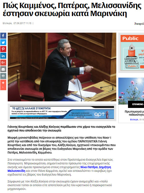 Επανερχόμεθα στην υπόθεση του δημοσιεύματος από την εφημερίδα «Παραπολιτικά» της 7ης Σεπτεμβρίου 2017. Όπως προαναφέρθηκε, το δημοσίευμα επιχειρεί τη στοχοποίηση ανθρώπων με σκοπό να τους εμπλέξει σε δήθεν σκευωρία κατά του εφοπλιστή Μαρινάκη. Όμως, το δημοσίευμα αυτό έχει μια ουρά, η οποία γίνεται αντιληπτή πολλούς μήνες αργότερα και συγκεκριμένα πριν από περίπου δύο εβδομάδες, όταν σε κάποια σελίδα του ενθέτου «Secret» της εφημερίδας «Παραπολιτικά», της οποίας μόνιμος συντάκτης είναι ο φερόμενος εκδότης της εφημερίδας Γιάννης Κουρτάκης, δημοσιεύεται ένα περίεργο μονόστηλο σε πλάγια μορφή και σε εμφανές σημείο.