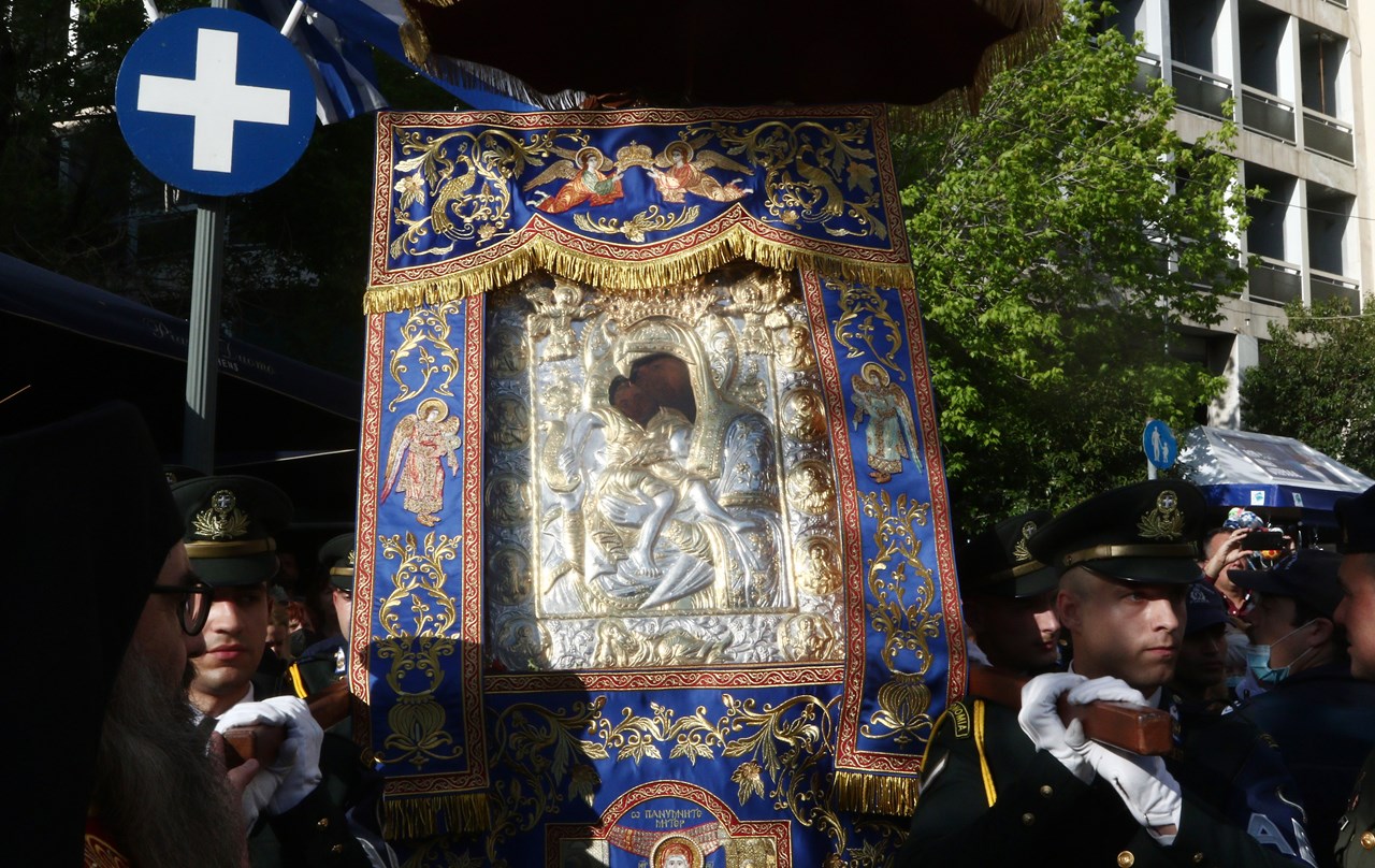 Σύμφωνα με τον προγραμματισμό κάθε 10 λεπτά μπαίνουν στη Μητρόπολη Αθηνών από 30 άτομα για να προσκυνήσουν το «Άξιον Εστί» την εικόνα που βγήκε για μόλις όγδοη φορά από το Άγιον Όρος και στην οποία η Παναγία κρατά τον Ιησού Χριστό από τα δεξιά και όχι από τα αριστερά. Η μεταφορά της ιερής εικόνας, η οποία εξέρχεται από το Άγιον Όρος μόνο σε ειδικές περιπτώσεις, ήταν παλαιότερο αίτημα του Αρχιεπισκόπου Ιερωνύμου για να λαμπρύνει με την παρουσία της την επέτειο των 200 χρόνων από την Επανάσταση του 1821. Ωστόσο, λόγω κορωνοϊού δεν κατέστη τότε δυνατή η έξοδός της από την Αθωνική Πολιτεία.