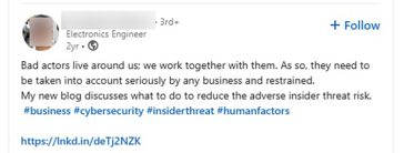 «Κακοί παράγοντες ζουν γύρω μας. Συνεργαζόμαστε μαζί τους. Ως εκ τούτου, πρέπει να λαμβάνονται σοβαρά υπόψη από κάθε επιχείρηση και να περιορίζονται. Το νέο μου ιστολόγιο συζητά τι πρέπει να γίνει για να μειωθεί ο κίνδυνος δυσμενών εσωτερικών απειλών».