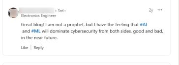 «Δεν είμαι προφήτης, αλλά έχω την αίσθηση ότι τα hashtag #AI και hashtag #ML θα κυριαρχήσουν στην κυβερνοασφάλεια και από τις δύο πλευρές, καλές και κακές, στο εγγύς μέλλον».