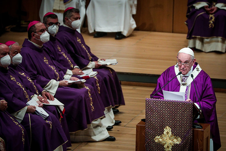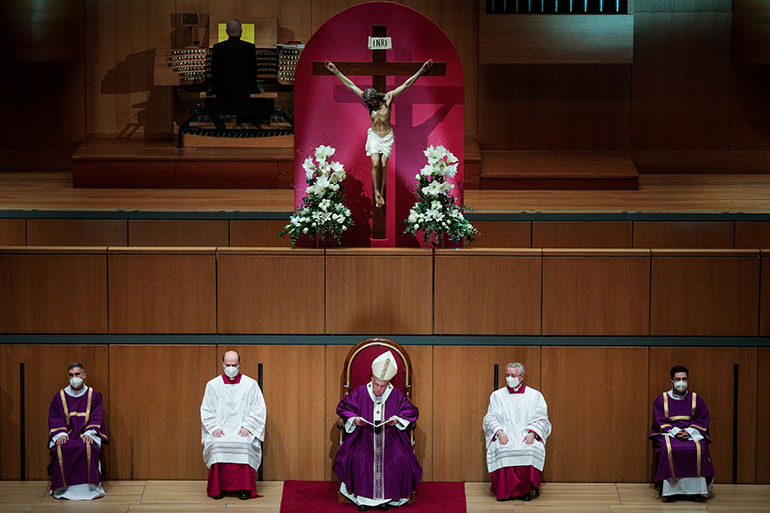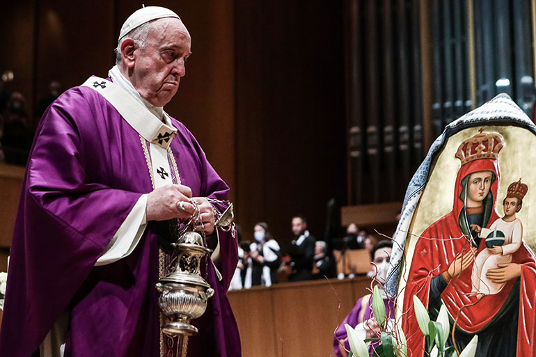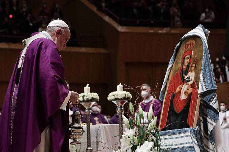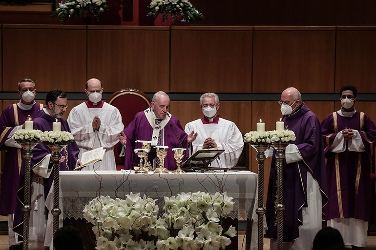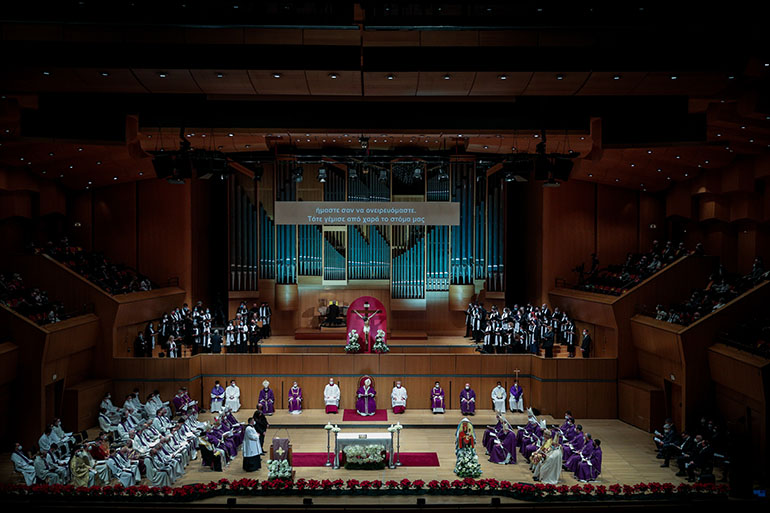 Τη Θεία Λειτουργία τελεί ο Πάπας Φραγκίσκος στην κεντρική αίθουσα του Μεγάρου Μουσικής.