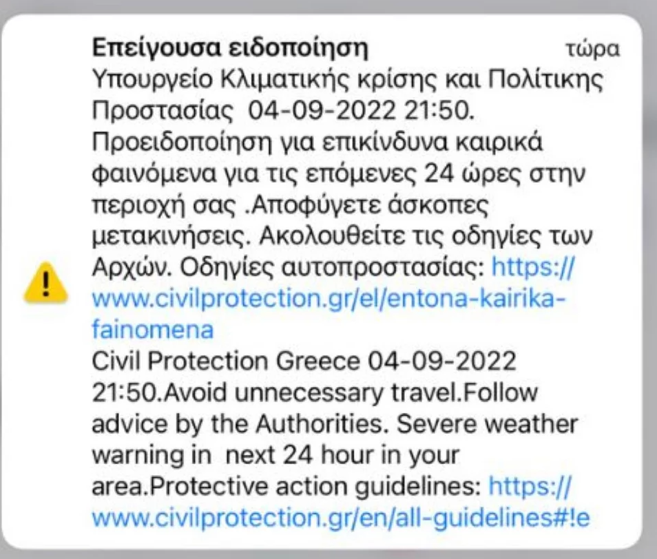 Παράλληλα, σημειώνεται ότι χθες στάλθηκε μήνυμα μέσω του 112 στους κατοίκους των περιφερειακών Ενοτήτων Θεσσαλονίκης, Ημαθίας, Πιερίας, Χαλκιδικής, Λάρισας & Μαγνησίας, καλώντας τους να αποφύγουν τις άσκοπες μετακινήσεις και προειδοποιώντας τους για την εκδήλωση επικίνδυνων καιρικών φαινομένων το επόμενο 24ωρο. Συγκεκριμένα το μήνυμα ανέφερε: « Προειδοποίηση για επικίνδυνα καιρικά φαινόμενα για τις επόμενες 24 ώρες στην περιοχή σας. Αποφύγετε άσκοπες μετακινήσεις. Ακολουθείτε τις οδηγίες των Αρχών. Οδηγίες αυτοπροστασίας: https://www.civilprotection.gr/el/entona-kairika-fainomena