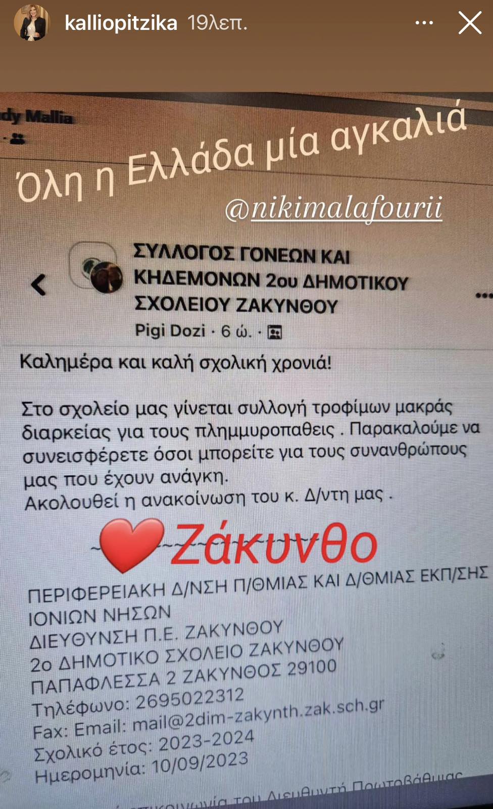 Από το story της Καλλιόπης Τζήκα Γενικής Γραμματέως του Επιμελητηρίου Λάρισας και Α’ αντιπροέδρου του ΕΕΔΕΓΕ (Εθνικό Επιμελητηριακό Δίκτυο Ελληνίδων Γυναικών Επιχειρηματιών). Ευχαριστεί το 2ο Δημοτικό Σχολείο Ζακύνθου για την ανθρωπιστική βοήθεια στους πλημμυροπαθείς.