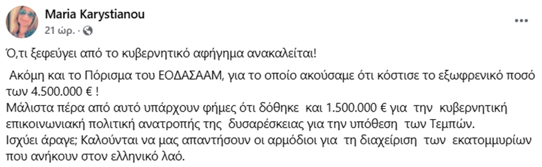 Μάλιστα πέρα από αυτό υπάρχουν φήμες ότι δόθηκε και 1.500.000 € για την κυβερνητική επικοινωνιακή πολιτική ανατροπής της δυσαρέσκειας για την υπόθεση των Τεμπών.