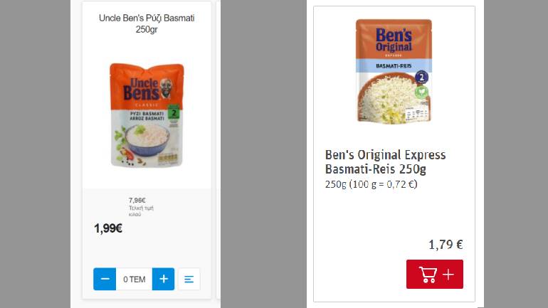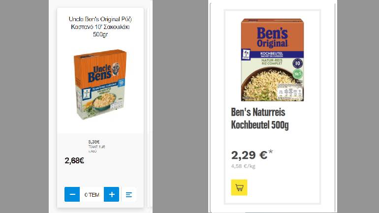 Το ίδιο συμπέρασμα συνάγεται και μετά τη σύγκριση των τιμών για τη συσκευασία Uncle Bens καστανό ρύζι των 500 γραμμαρίων. Στην Ελλάδα στοιχίζει 2,68 ευρώ. Στη Γερμανία 2,29. Περίπου 40 λεπτά του ευρώ φθηνότερα δηλαδή.