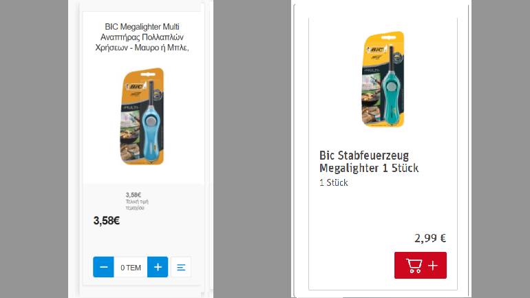 Ας πάμε, τώρα, σε ένα εντελώς διαφορετικό προϊόν, βιομηχανικής προέλευσης. Πρόκειται για έναν αναπτήρα τον οποίο αγοράζουμε στα σούπερ μάρκετ. Ο αναπτήρας στην Ελλάδα κοστίζει 3,58 ευρώ. Στη Γερμανία ο ίδιος αναπτήρας πωλείται προς 2,99 ευρώ. Πραγματικά δυσεξήγητη η διαφορά. Κι ας μην ακούσουμε ως επιχείρημα το περίφημο περί εισαγόμενης τεχνολογίας, διότι θα γελάσει και ο κάθε πικραμένος.
