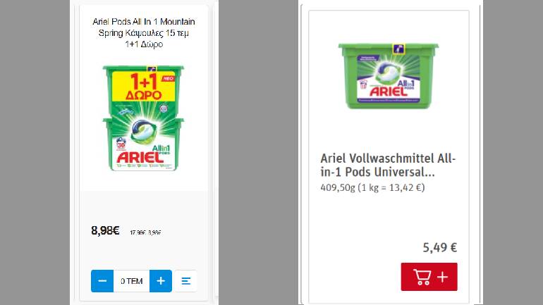 H εικόνα στην κατηγορία των απορρυπαντικών είναι διαφορετική. Στις ταμπλέτες της μάρκας ARIEL οι τιμές είναι διαμορφωμένες ως εξής: Η συσκευασία των 15 τεμαχίων πωλείται στη Γερμανία προς 5,49 ευρώ. Η διπλή ποσότητα στην Ελλάδα προς 8,98 ευρώ. Αν υποδιπλασιάσουμε, τότε η τιμή στο ράφι για τις ταμπλέτες αυτές είναι 4,45 ευρώ, δηλαδή φθηνότερα από τη Γερμανία.