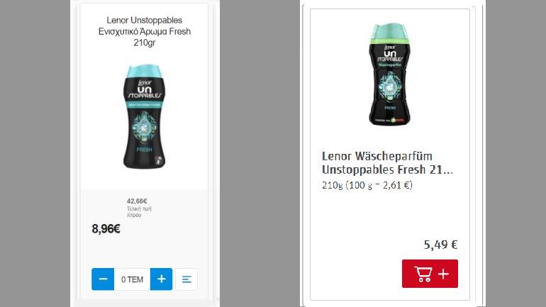 Στην περίπτωση του μαλακτικού για τα ρούχα, μάρκας Lenor, η κατάσταση έχει ως εξής: Η τιμή του λίτρου στη Γερμανία είναι 26,10 ευρώ. Στην Ελλάδα η τιμή του λίτρου εκτοξεύεται στα 42,68. Πολύ ακριβότερο δηλαδή. Ως προς τις ίδιες συσκευασίες που πωλούνται στο ράφι, το Lenor στη Γερμανία πωλείται προς 5,49 ευρώ, ενώ στο ελληνικό σούπερ μάρκετ προς 8,96 ευρώ. Δείτε τις αντίστοιχες αναρτήσεις στις ιστοσελίδες αυτών των προϊόντων.