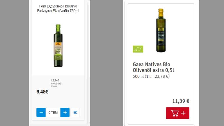 Τέλος, το λάδι ελιάς μάρκας «ΓΑΙΑ» πωλείται στη Γερμανία προς 22,78 ευρώ το λίτρο. Στην Ελλάδα πωλείται προς 12,60 το λίτρο. Πρόκειται για έξτρα παρθένο βιολογικό ελαιόλαδο. Οι τιμές που αναφέρονται παραπάνω υπολογίστηκαν επί των τιμών που αναγράφονται στις συσκευασίες που πωλούνται στη Γερμανία και στην Ελλάδα. Στα ελληνικά σούπερ μάρκετ είναι διαθέσιμη η συσκευασία των 750 ml. Στη Γερμανία προσφέρεται η συσκευασία των 500 ml.