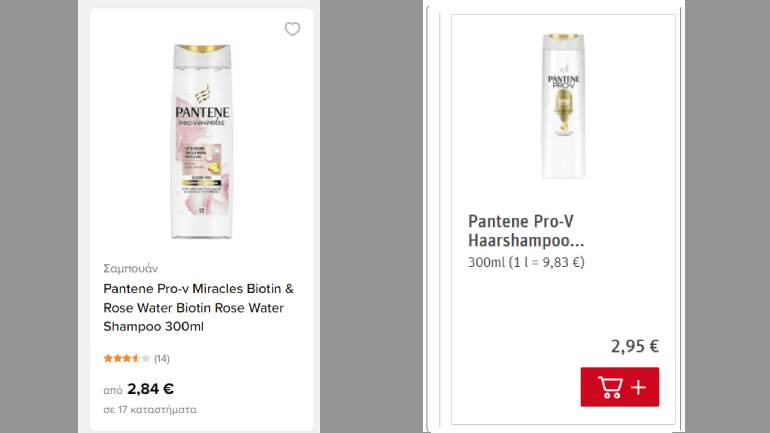 Το πολύ γνωστό σαμπουάν Pantene στη συσκευασία των 300 ml, στην Ελλάδα πωλείται προς 2,84 ευρώ, ενώ στη Γερμανία 2,95. Οι συσκευασίες είναι ισόποσες. Πρόκειται για άλλη μία περίπτωση εξαίρεσης (το παρατηρήσαμε και στις τιμές του απορρυπαντικού ARIEL) που επιβεβαιώνει τον κανόνα. Η τιμή του συγκεκριμένου βιομηχανικού προϊόντος είναι μεγαλύτερη στη Γερμανία σε σχέση με την Ελλάδα.