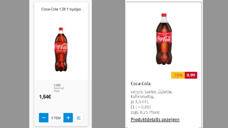 Όπως και στη συσκευασία του ενάμισι λίτρου Cola-Cola. Στη Γερμανία κοστίζει 0,99. Στην Ελλάδα το ίδιο ακριβώς προϊόν στο ράφι κοστίζει 1,54 ευρώ. Μιλάμε για την ίδια εταιρεία παραγωγής και εμφιάλωσης αλλά και διακίνησης, την ελληνικής καταγωγής εταιρεία Coca-Cola HBC, με έδρα την Ελβετία, της οικογένειας Λεβέντη – Δαυίδ. Είναι δυνατόν ο Έλληνας καταναλωτής να πληρώνει 55 ολόκληρα λεπτά παραπάνω από τον Γερμανό για την ίδια ποσότητα και ποιότητα προϊόντος;