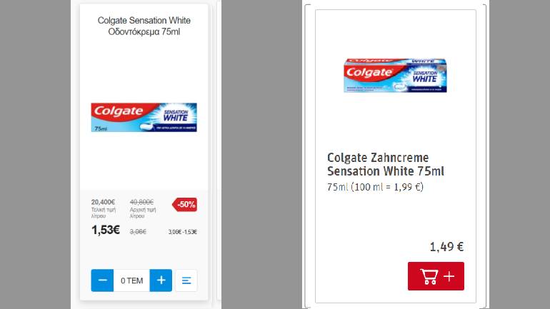 Μία ακόμη σύγκριση: Το σωληνάριο οδοντόκρεμας Colgate των 75 ml κοστίζει στη Γερμανία 1,49 ευρώ. Το ίδιο σωληνάριο στην Αθήνα κοστίζει 1,53 ευρώ. Τα συμπεράσματα δικά σας.