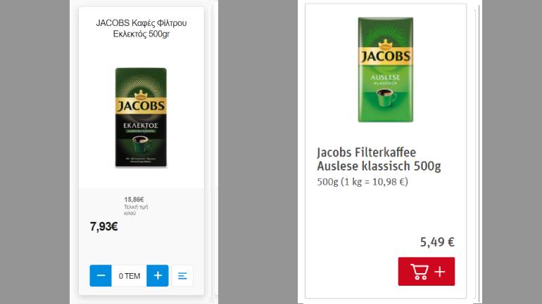 Ας συγκρίνουμε, τώρα, την τιμή πώλησης του γνωστού καφέ φίλτρου Jacobs. Στη Γερμανία τα 500 γραμμάρια κοστίζουν 5,49 ευρώ. Στην Ελλάδα 7,93. Η διαφορά υπέρ του Γερμανού καταναλωτή σαφής και ευδιάκριτη.