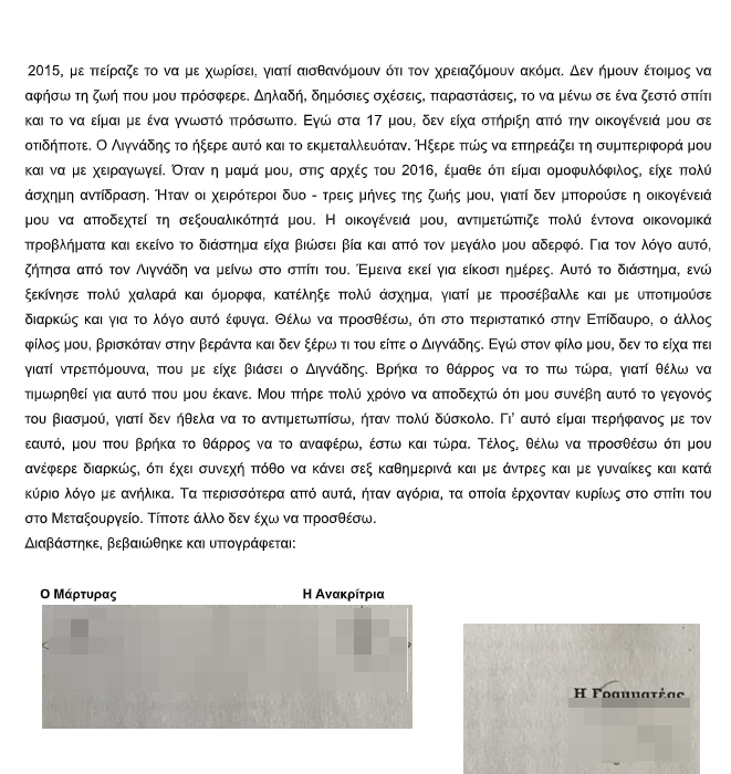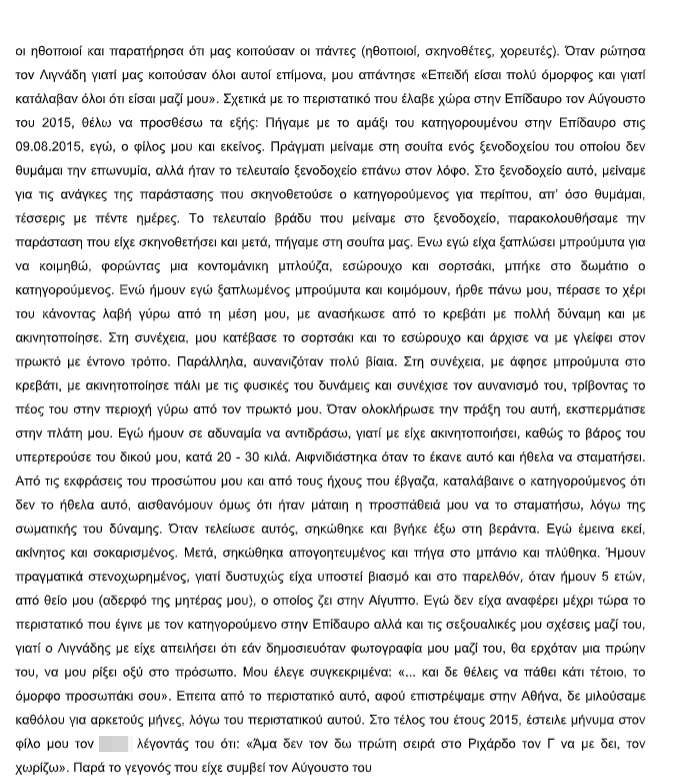 Λιγνάδη”. Αυτό μας έκανε να αισθανόμαστε στην εφηβική μας ηλικία, σπουδαίοι, σημαντικοί και ξεχωριστοί. Πηγαίναμε πολύ συχνά στις θεατρικές του παραστάσεις, τόσο σε μεγάλα θέατρα, όσο και σε μικρότερες σκηνές. Ήταν ιδιαίτερα χειριστικός με εμάς στην ευαίσθητη ηλικία που ήμασταν και ήξερε ακριβώς τον τρόπο συμπεριφοράς του στον καθένα μας. Εκμεταλλευόταν τις συναισθηματικές μας ανάγκες και την έλλειψη στηρίγματος από το οικογενειακό μας περιβάλλον. Με τον τρόπο αυτό μας χρησιμοποιούσε για να διενεργεί και γενετήσιες πράξεις μαζί μας. Ειδικότερα, εγώ του έκανα στοματικό έρωτα, θωπείες στο σώμα, εκείνος με έγλειφε στο σώμα. Με τον έναν από ”τα παιδιά του” είχε κάνει πρωκτικό σεξ», τονίζει μεταξύ άλλων.