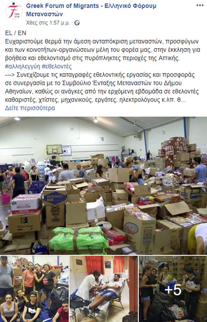Μετανάστες, πρόσφυγες και κοινότητες-οργανώσεις, μέλη του Ελληνικού Φόρουμ Προσφύγων ανταποκρίθηκαν άμεσα στην έκκληση για βοήθεια και εθελοντισμό και μετέβησαν στις πυρόπληκτες περιοχές.