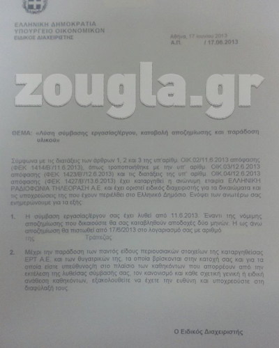 Κι ενώ σε αρκετούς από τους εργαζόμενους δεν έχει κοινοποιηθεί καν η απόλυσή τους –πόσο μάλλον να λάβουν τη νόμιμη αποζημίωσή τους-, κάτι που αφορά και στους ανταποκριτές της ομογένειας που εργάζονταν στην Αυστραλία- όσοι έχουν στα χέρια τους το χαρτί της απόλυσης, διαβάζουν ότι εκτός της λήψης των μισθών δύο μηνών ως έναντι αποζημίωσης, «μέχρι την παράδοση των παντός είδους περιουσιακών στοιχείων της καταργηθείσας ΕΡΤ Α.Ε. και των θυγατρικών της, τα οποία βρίσκονται στην κατοχή σας και για τα οποία είστε υπεύθυνος/η στο πλαίσιο των καθηκόντων που απορρέουν από την εκτέλεση της λυθείσας σύμβασής σας (…), εξακολουθείτε να έχετε την ευθύνη και υποχρεούστε στη διαφύλαξή τους»…