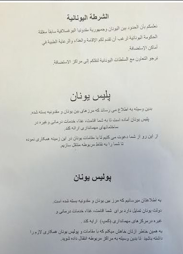 “Σας ενημερώνουμε ότι τα σύνορα μεταξύ Ελλάδας και ΠΓΔΜ έχουν κλείσει. Η Ελλάδα θα σας παράσχει διαμονή, σίτιση, ιατροφαρμακευτική περίθαλψη κ.λπ., όπως και δομές φιλοξενίας. Κατόπιν τούτου, παρακαλούμε για τη συνεργασία σας με τις ελληνικές αρχές, προκειμένου να μεταφερθείτε στους εν λόγω χώρους φιλοξενίας”.