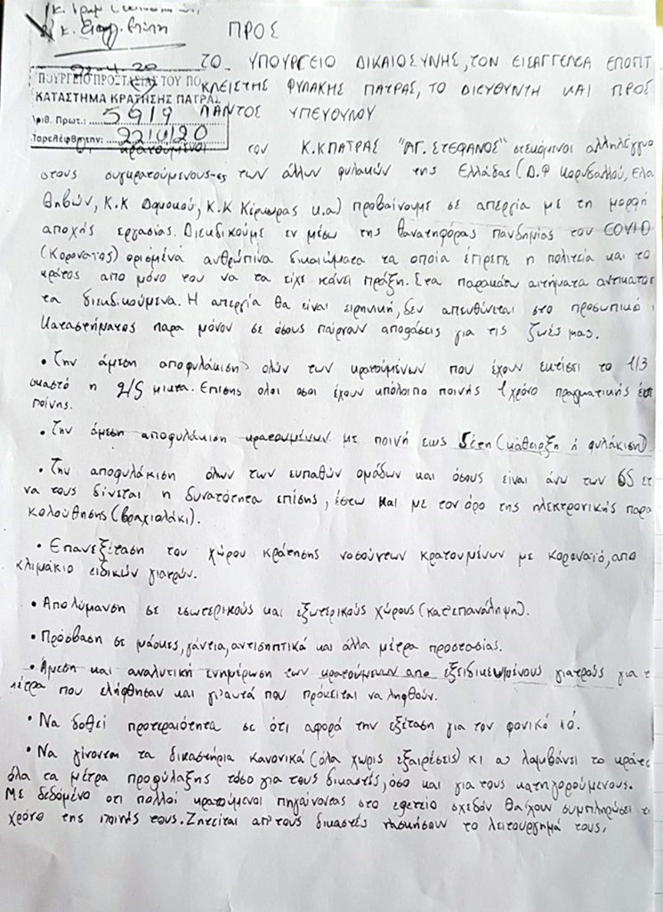 ανεπαρκή, όπως λένε, μέτρα που έχουν ληφθεί εντός του σωφρονιστικού καταστήματος για την αποτροπή μετάδοσης του Covid-19 και να ζητούν να γίνει άμεσα αποσυμφόρηση των φυλακών ώστε να διασφαλιστεί η υγεία τους.