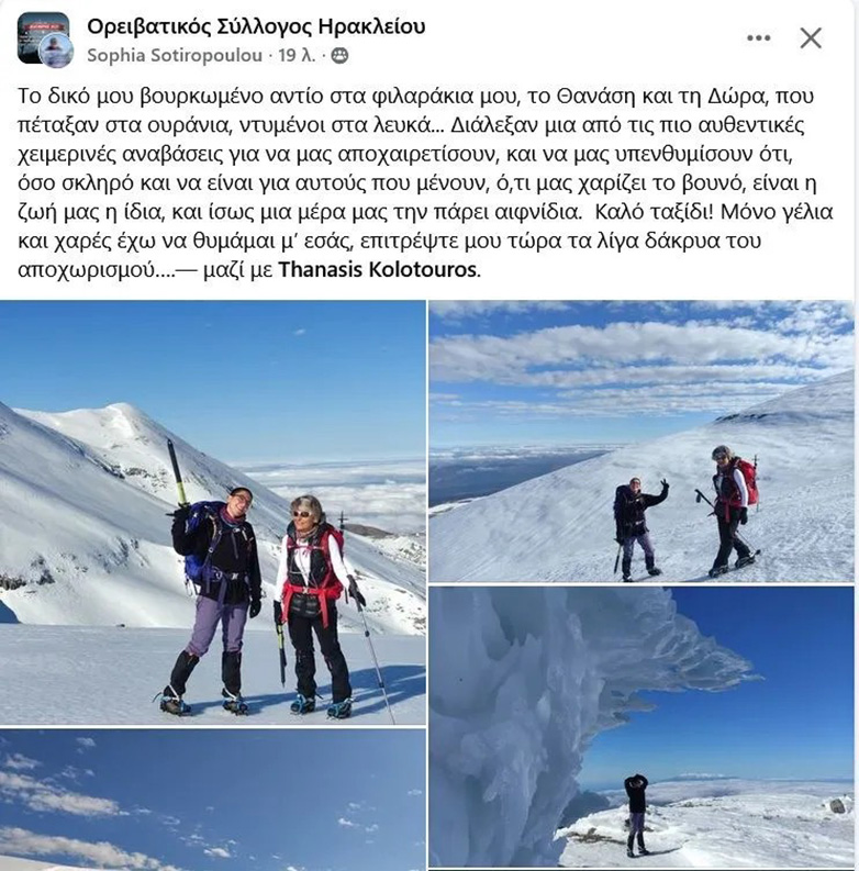 Μέλη του Ορειβατικού Συλλόγου Ηρακλείου αποχαιρετούν και εκείνοι τον Θανάση και τη Δώρα, που πέταξαν στα ουράνια, ντυμένοι στα λευκά…