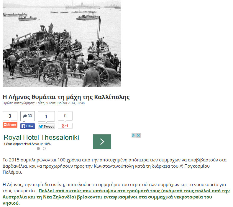 * Εκστρατεία της Καλλίπολης ή εκστρατεία των Δαρδανελίων ή Μάχη της Καλλίπολης ή Μάχη του Τσανάκκαλε: Χερσόνησος της Καλλίπολης στην Οθωμανική Αυτοκρατορία (στην Γκελίμπολου της σημερινής Τουρκίας) από τις 25 Απριλίου του 1915 μέχρι τις 9 Ιανουαρίου του 1916. Α’ Παγκόσμιος Πόλεμος. Βρετανικά και γαλλικά στρατεύματα, με την υποστήριξη στρατιωτικών δυνάμεων από Αυστραλία και Νέα Ζηλανδία επιχείρησαν να θέσουν υπό τον έλεγχό τους τα Δαρδανέλια. Η εκστρατεία δεν στέφθηκε με επιτυχία. Τεράστιες απώλειες για τους Συμμάχους και μια από τις μεγαλύτερες νίκες των Οθωμανών. Κατά τη διάρκεια των επιχειρήσεων, η Λήμνος αποτέλεσε σημαντική στρατιωτική βάση των Συμμάχων. Δύο συμμαχικά νεκροταφεία υπάρχουν μέχρι σήμερα στο ακριτικό νησί και κάθε χρόνο πραγματοποιείται επιμνημόσυνη δέηση.